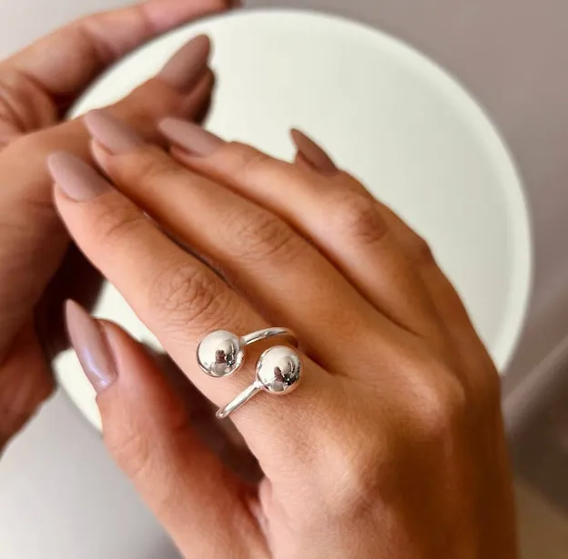 Anel duas bolas, regulável, antialérgico e banhado a prata 925.